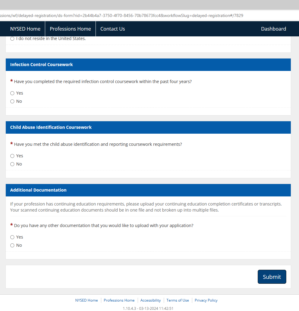 면허를 살리기 위해서는 1) Delayed Registration Application을 작성하여야하고, 2) Child Abuse 및 Infection Control 관련 보수교육을 이수하거나 또는 뉴욕에서 일할 계획이 없다면 Form 1ce, 1ic를 작성하여 함께 제출하여야 한다.
