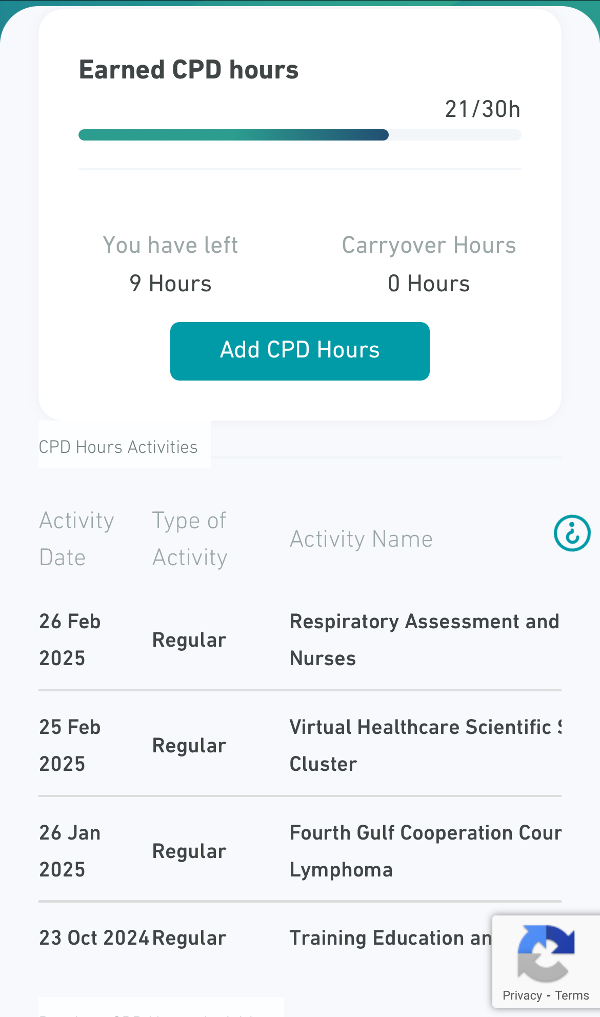 > SCFHS의 DashBoard, 내가 그동안 획득한 CPD 시간을 확인할 수 있다.