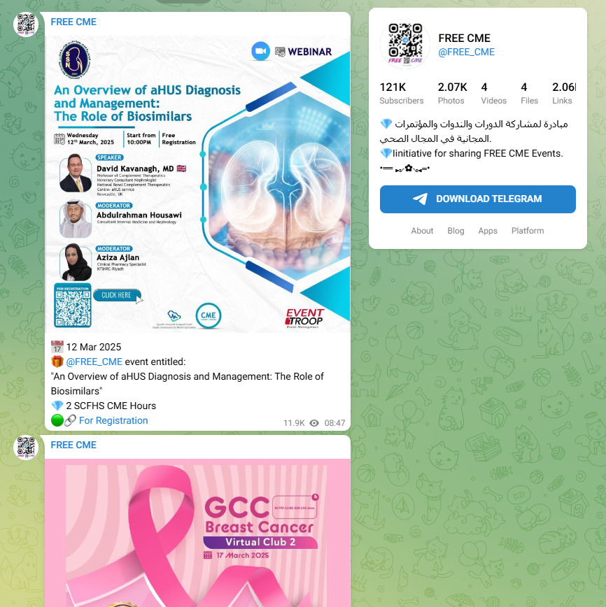 텔레그램 베이스의 CME 정보가 올라오는 곳이다. 텔레그램을 가입 또는 APP을 설치하지 않아도 웹페이지에서 정보를 확인할 수 있다. 다른 헬스케어직종만을 대상으로 한 교육, CME가 제공되지 않는 교육도 있으니 살펴보고 등록하는 것이 좋다. (교육 일정보다 미리 여유있게 정보가 업데이트 되는 경우도 있긴 하지만, 당일에 정보가 올라오는 경우도 많다.)