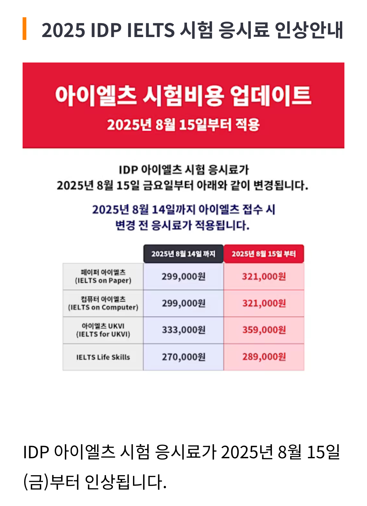 IDP 아이엘츠 시험 응시료가 2025년 8월 15일(금)부터 인상됩니다.