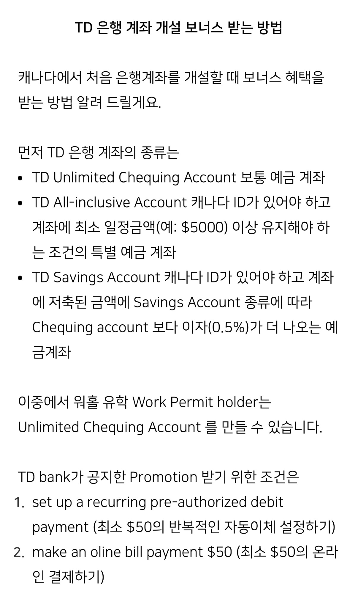수퍼셀 블로그에 TD 계좌 개설 후 보너스를 받는 방법까지 자세히 정리되어 있어서, 캐나다 랜딩 후 계좌 개설 계획도 함께 세워두었다.